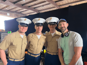 From left: Angus O’Brien, Miles Heizer, Liam Oh, and Andy Parker on the set of Boots (Courtesy of Netflix)